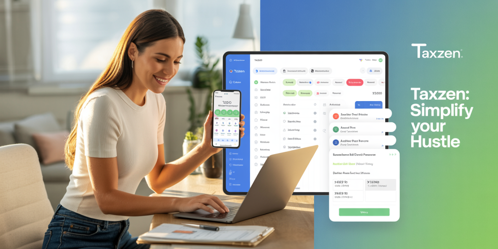 A visual representation of organized tax preparation for side hustlers: a freelancer using accounting software on a laptop, a smartphone app tracking mileage, and labeled folders for receipts and estimated tax payments, conveying streamlined financial management.