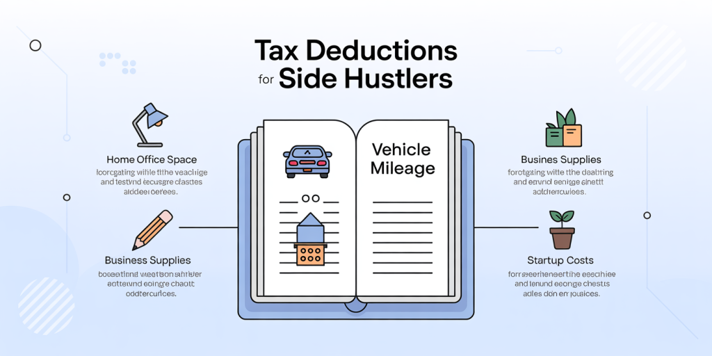 A detailed infographic-style image showing common tax deductions for side hustlers, including home office space, vehicle mileage, business supplies, and startup costs, with icons and brief descriptions for each category.
