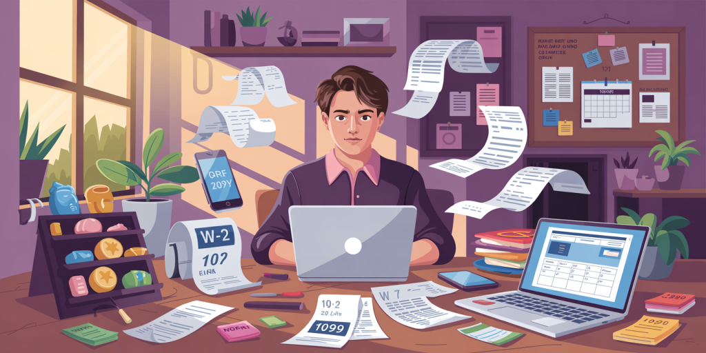 An illustration of a gig economy worker juggling multiple side hustles like ride-sharing, freelancing on a laptop, and selling crafts online, with tax forms (W-2, 1099) and receipts scattered around, symbolizing complex tax responsibilities.
